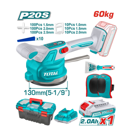 VIBRADOR DE BALDOSA INALAMBRICA 20V CON VENTOSA CAP 60KG INCLUYE 1 PAR DE RODILLERAS, ESPATULA, SEPARADORES DE BALDOSA (1.5-2.0-2.5), 1 BATERIA 2.0AH , CARGADOR Y CAJA HERRAMIENTA INDUSTRIAL TOTAL (UTTVLI20018)